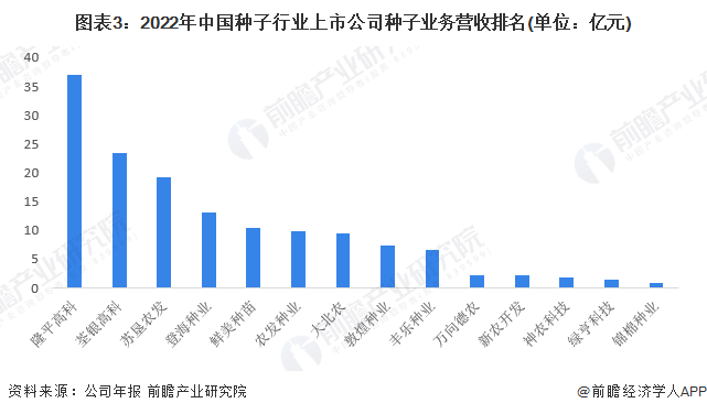 2022年,在中国种子行业上市公司中,隆平高科、荃银高科、苏垦农发等种子业务营收规模领先。隆平高科种业收入超过35亿元,位列行业第一。荃银高科种业营收超过20亿元,苏垦农发超过15亿元,分别位列第二和第三。