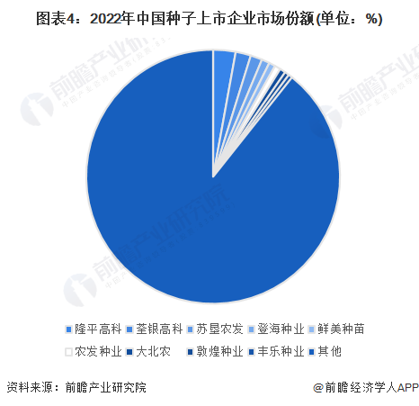 2022年,中国种子上市公司中,隆平高科、荃银高科、苏垦农发、登海种业种子相关业务营收占比均超过1%,隆平高科的市场份额最大达到2.85%。