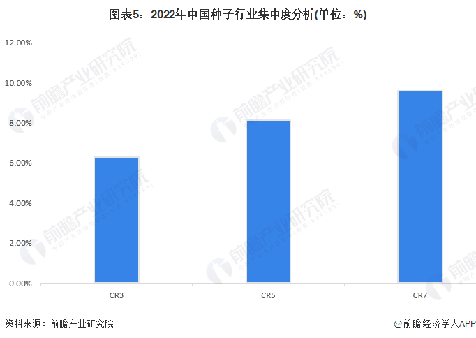 中国种子行业集中度较低,2022年行业前7家企业种业营收占比合计(CR7)低于10%。根据Kynetec统计数据,早在2020年,全球种业中前5名企业市场份额合计已经达52%。而在2022年,中国种子企业集中度和全球市场比仍有较大的差距,行业竞争分散局面仍未改变。