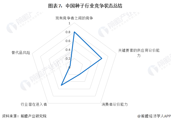 根据以上分析,对各方面的竞争情况进行量化,1代表最大,0代表最小,目前我国种子行业五力竞争总结如下: