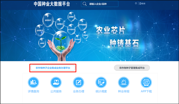 访问中国种业大数据平台,点击农作物种子企业集成业务办理平台链接。