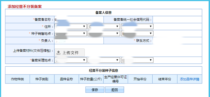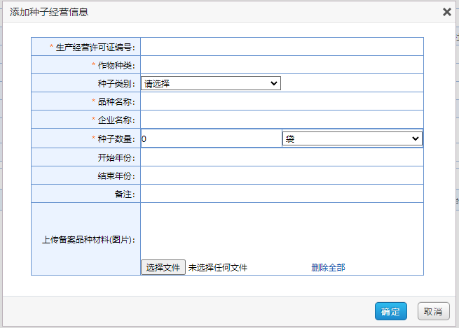 填写正确的生产经营许可证编号、种子类别、品种名称、种子数量等相关信息,选择上传附件,点击【确定】按钮完成备案信息填写。