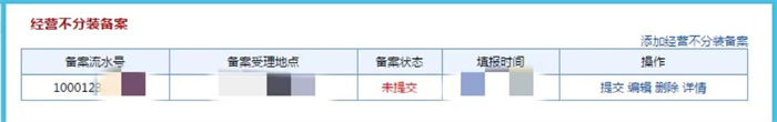点击备案管理功能里的【经营不分装备案】按钮进入经营不分装备案界面。点击【添加经营不分装备案】按钮,进入到添加经营不分装备案界面。