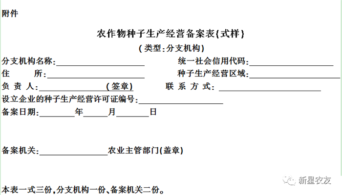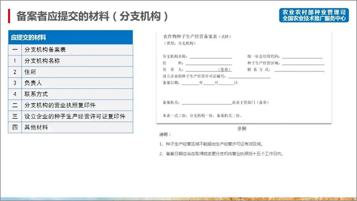 办法第二十二条规定,种子生产经营者在种子生产经营许可证载明有效区域设立的分支机构,应当在取得或变更分支机构营业执照后十五个工作日内向当地县级农业主管部门备案。备案时应当提交分支机构的营业执照复印件、设立企业的种子生产经营许可证复印件以及分支机构名称、住所、负责人、联系方式等材料。