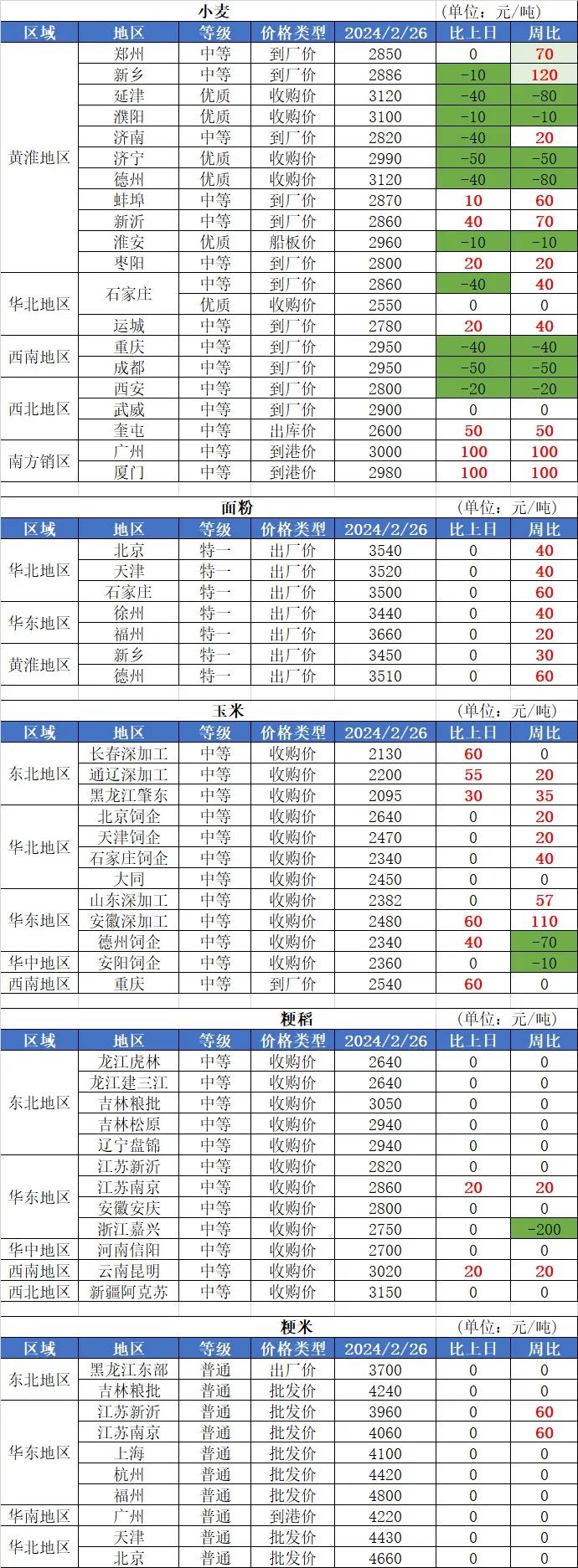 1、今日国内小麦收购价格大范围下跌,元宵过后,基层持粮主体售粮节奏加快,逢高出售意愿增强;雨雪天气过后交通条件改善,粉企上量增加,小麦价格开始下跌。