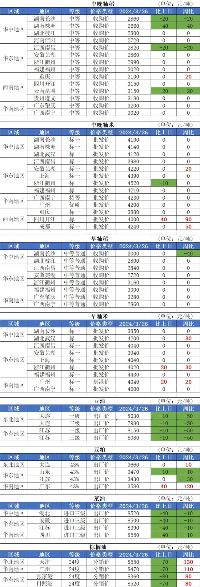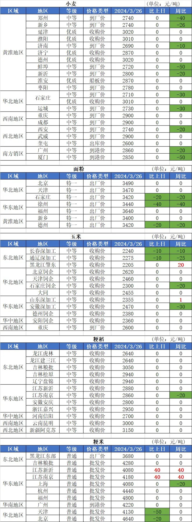 2、3月26日国内玉米价格局部下跌,其中:南方销区、南北港口、华北地区玉米价格基本稳定;东北地区玉米价格基本稳定,局部价格小幅波动,幅度10-60元/吨。