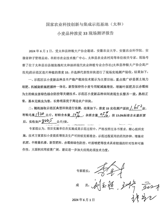 6月1日,在国家农业科技创新与集成示范基地(太和淙祥现代农业种植专业合作社)小麦好品种淮麦33的示范区,来自省、市、县三级农业主管单位的专家宣布淮麦33的实收亩产突破了822.5公斤。