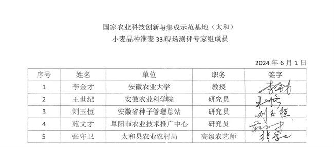 此次测评汇集了安徽农业大学、安徽农业科学院、安徽省种子管理总站、阜阳市农业技术推广中心及太和县农业农村局等单位的专家组成测评专家组。由安徽省小麦产业体系首席李金才教授担任专家组组长,专家们听取了基地各品种示范情况的汇报,并实地考察了连片种植的淮麦33等小麦品种。在随机选择的代表性田块中,专家们进行了现场测评。