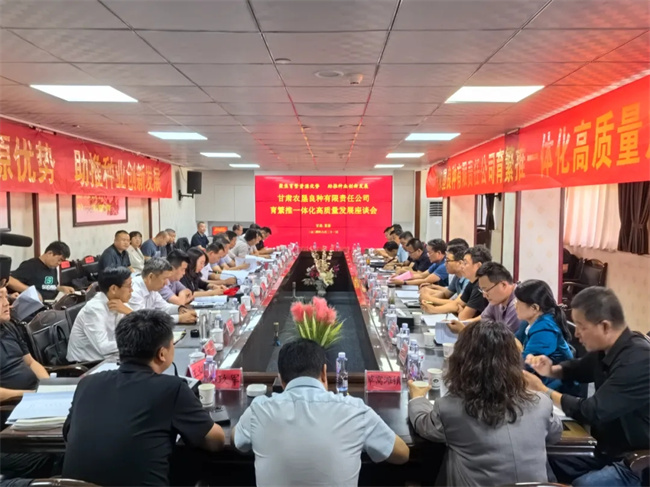 座谈会上,亚盛股份公司党委书记、董事长连鹏致欢迎词。他表示,近年来,亚盛股份公司紧跟国家整体战略规划,加快布局制种产业,整合优质种业资源,在科技研发、人才支撑、品牌建设等方面取得了可喜成绩,希望种业集团扛牢种业振兴责任,在振兴民族种业、种业强省行动、地方经济发展中贡献力量;亚盛种业集团副总经理、农垦良种公司总经理马玖军重点从科研体系创新、生产基地建设、加工储藏能力提升、销售网络拓展、社会化服务延伸五个方面汇报了公司育繁推一体化发展现状,对公司下一步加强企地融合、推动育繁推一体化高质量发展作了介绍;与会嘉宾围绕育种技术攻关、良种繁育基地建设、人才培养、平台建设、合作交流、成果转化等方面从各自专业领域畅所欲言,共同探讨育繁推一体化发展新思路、新模式;景泰县委常委、统战部部长王涛分析了景泰县玉米制种产业发展现状,提出了一系列推动制种产业发展的有力举措,对农垦良种公司育繁推一体化发展提出了新期望;甘肃省农业农村厅二级巡视员张有祖在听取各方意见后作总结性发言,认为此次座谈是贯彻落实中央一号文件精神的具体体现,是落实省委省政府建设农业强省、做大做强甘肃种业的有效举措,对下一步建设高标准玉米种子繁育及生产示范基地、提高机械化作业水平、引进先进加工设备和加工工艺等方面起到了积极作用。座谈会后,参会人员前往公司高标准农田玉米制种基地进行现场观摩,现场负责人汇报了2024年玉米制种生产概况及当前工作推进情况。