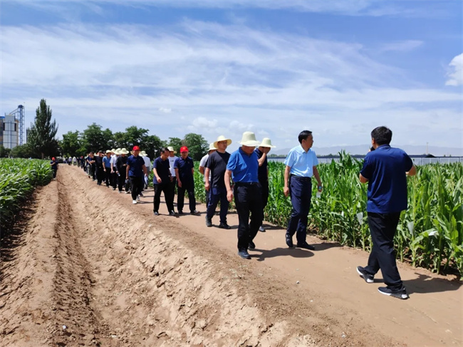 观摩结束后,还举行了亚盛种业集团景泰育种站、兰州大学生命科学学院生物与医药专业学位研究生联合培养实践基地、农垦良种公司育种基地揭牌仪式,张有祖、侯岁稳、连鹏、王涛共同为育种站揭牌。侯岁稳表示,希望院企双方继续深化产学研全方位合作,为双方人才培养、科研合作打下坚实基础;王涛表示,近年来景泰县坚定不移推动种业产业转型升级,取得了显著成果,希望与会各方依托各自资源、市场和平台优势,在玉米制种产业方面进行全方位、深层次、多元化融合,建立更加持续、稳定、紧密的合作关系,推动全省玉米制种产业更好更快发展;参会人员还参观了景泰育种站试验田,实地观摩试验材料长势,了解科研育种工作推进情况,并进行合影留念。