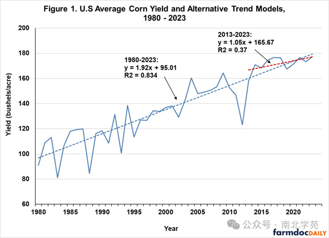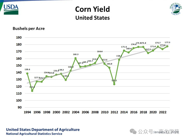 单产增加趋势的斜率(趋势线)主要是由杂交种、害虫防治、土壤管理、机械化、精准农业等农业技术的重点变化引起的。趋势线的逐年偏离(变化)主要是由生长条件的逐年变化引起的(例如天气和病虫害)。看趋势,时间段短的话需要非常慎重,因为个别特殊年份的数据可能导致对预估产生很大的影响。比如2012年到干旱导致大幅减产。一般分析从1956年以后的时间段,因为该时间段占了当时和现在玉米产量变化的93%。
