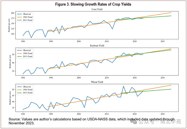 2013-2023年(图3、图4),单产增加幅度放缓为约每年1.05 bushels/acre。