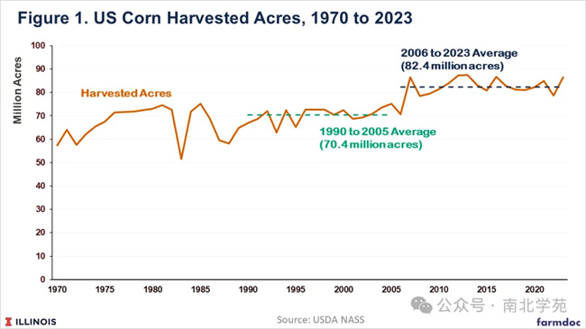 1、自2006年以来,玉米需求的增加,尤其是乙醇需求的增加,导致美国玉米种植面积增加。2006-2023年平均种植面积8240万英亩,比1990-2005年平均约7040万英亩,增加了约17%。且增加主要来自堪萨斯州、北达科他州、南达科他州、内布拉斯加州和明尼苏达州等低产量地区,影响美国全国玉米平均产量。据估计,2006年之后增加的面积使美国平均玉米产量下降了2.2蒲式耳,也导致了美国玉米产量趋势估计的小幅下降。