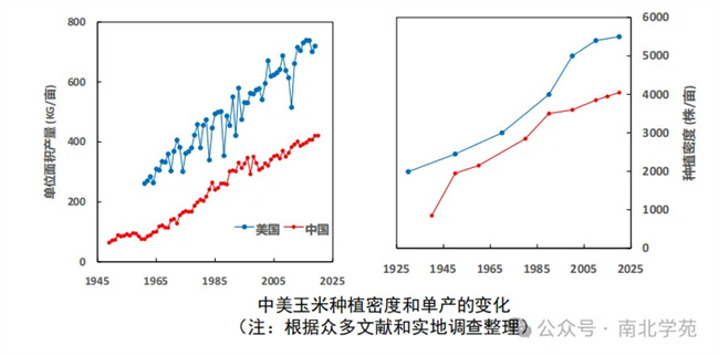 1950年以后美国玉米单产持续以1.9蒲式耳每年每英亩的增速增长,原因有很多,主要有原来单产基数低、化肥、遗传改良育种、高质量种子、机械化、除草剂杀虫剂杀菌剂等农药、转基因技术、种植管理技术等综合原因。智种网之前分享过一些文章表明,过去几十年的品种在理想环境下单株产量潜力几乎没有变化,主要变化是新品种更加耐密、更适合新气候及种植环境下的非生物胁迫,灌浆期延长等变化。李少昆老师的图表也显示美国玉米单产的增加很大程度上由于种植密度的提升。汤继华老师团队最近几年的重点方向也是奔着每亩6000-7000株/亩测试和推广努力。