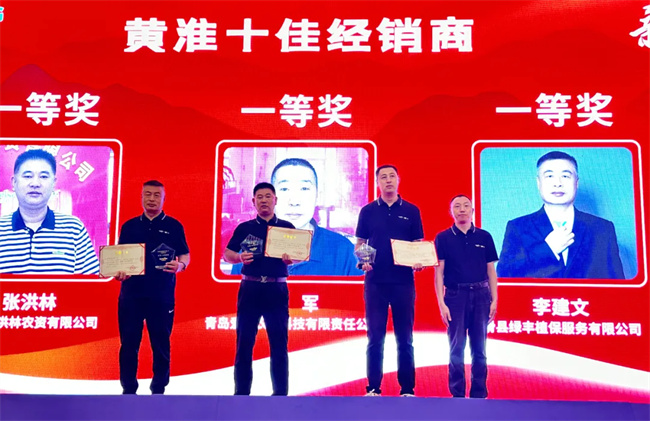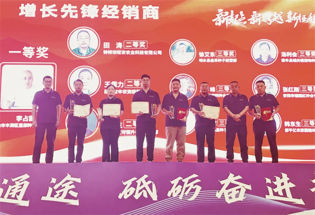 本次表彰设置黄淮十佳经销商与增长先锋经销商两大类,共计20个奖项。安徽隆平苏皖营销中心经理张同景和黄淮海事业部总经理亓良吉分别为获奖者颁奖。
