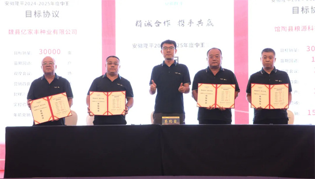 锚定目标,坚定行动。中玉303扬帆远航再出发!明确工作目标的重要性不言而喻。在大家的共同见证下,山东、河南、河北、苏皖区域的客户代表分别与安徽隆平各营销中心负责人签订安徽隆平2024-2025年度中玉303目标协议。