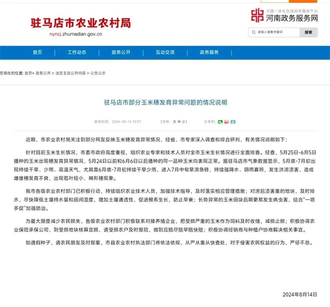 近期,市农业农村局关注到部分网友反映玉米穗发育异常情况,经省、市专家深入调查和综合研判,有关情况说明如下: