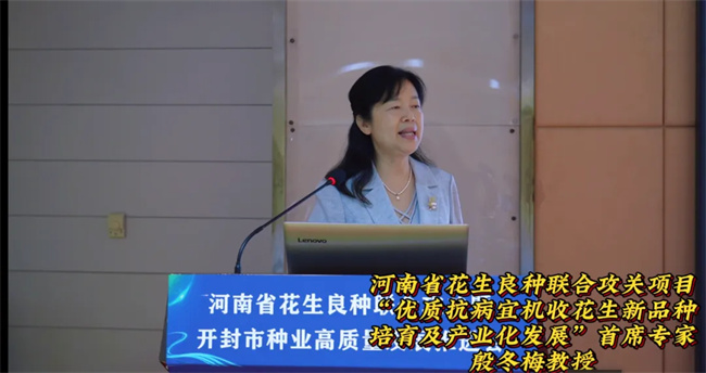 河南省花生良种联合攻关项目“优质抗病宜机收花生新品种培育及产业化发展”首席专家、河南农业大学教授殷冬梅做项目实施情况汇报。殷冬梅表示,坚持培育出抗性好、产量高,挖掘优异种质资源和新品种创制,通过项目实施,选育抗性更强、品质更优、产量更高的突破性品种是良种联合攻关的主要目标。