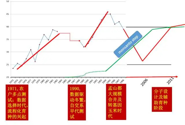 当今社会发展飞速,各行各业都发生了翻天覆地的变化。唯独农业发展落后,尤其种业。我们以下图简单的回顾一下美国两大巨头种子公司的对比,来说明技术带来的巨大变化(颠覆式创新)。我很早读过《三体》,延伸出“升维思考、降维打击”的思考,只在一个点上思考往往是无效的,这才是颠覆式创新的核心思想,你有没有那样的思想和格局,有没有大的格局下重构思想模式,然后再找到一个基本点去切入。下图中我们可以看出四次(创新)大的变化带来公司业绩的大幅上升。第一次,1971年,当别的公司还在一个区域或少数几个点时,先锋采用多点测试使得品种推广时更加精确;第二次,冬繁和早代测试再次使得先锋超越其它公司;第三次,这次孟山都摆脱传统做法,实现颠覆式创新,利用转基因技术迅速超越先锋(因为打法完全发生了变化。);第四次,分子设计育种使得先锋再次反超。