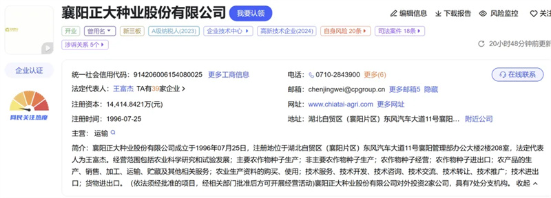公开信息显示,正大种业成立于1996年,注册资本超1.4亿元,是一家主要从事种子研发、生产、销售的种子,目前是中国种业信用骨干企业成员和国家育繁推一体化玉米种业企业。