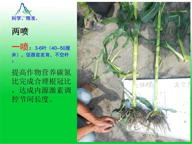二喷:8-12叶期,代替抑制类控旺剂,抗倒防病,调节大小苗,让锥形棒变桶形棒,补充中后期各种营养并促进中后期玉米生长。