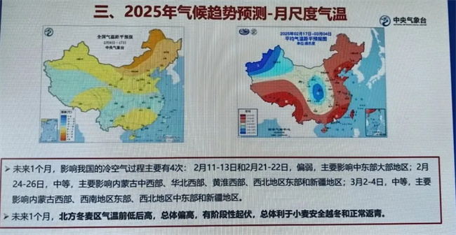 未来1个月,影响我国的冷空气过程主要有4次:2月11-13日和2月21-22日,偏弱,主要影响中东部大部地区;2月24-26日,中等,主要影响内蒙古中西部、华北西部、黄淮西部、西北地区东部和新疆地区;3月2-4日,中等,主要影响内蒙古西部、西南地区东部、西北地区中东部和新疆地区。