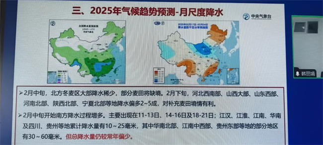 今日雨水,全国气温逐渐回升,主产区冬小麦即将陆续返青,眼下正是抓好春季田间管理、促进苗情转化升级、稳穗增粒的关键时期。2月8日,由全国农技中心主办的2025年粮食作物生产和田间管理(第一期)暨小麦春季田管技术网络培训班上,国家气象中心研究员韩丽娟就2月份气候及春季气候趋势做详细介绍: