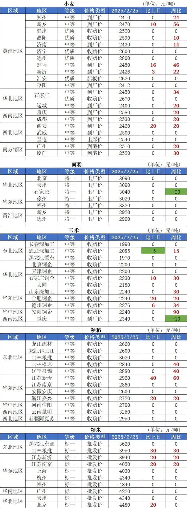1、2月25日,国内小麦市场偏强运行。其中,商丘五得利涨1分,含票价1.23元/斤;武城发达涨1分,含票价1.22元/斤;发达面业涨1分,含票价1.22元/斤;禹城五得利涨8厘,含票价1.225元/斤。