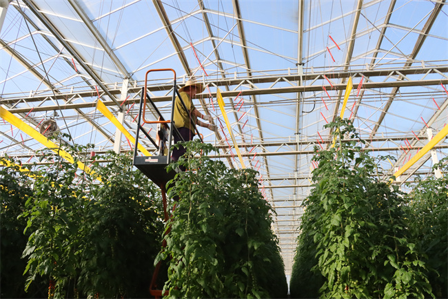 在温室内,看不到一粒土壤,取而代之的是整齐排列的种植槽。这些种植槽内填充着少量的基质,为番茄根系提供了稳定的生长环境。每天,专业的工作人员都会精心监测温室内的温度、湿度和灌溉情况,确保番茄在最适宜的环境中生长。同时,他们还会利用升降机进行剪枝和落枝工作,确保番茄植株的通风透光,提高产量和品质。