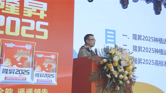 安徽隆平隆平事业部总经理亓良吉出席大会,并在启动会发表主题演讲,他就隆昇2025的营销策略和项目政策做了详细解读。