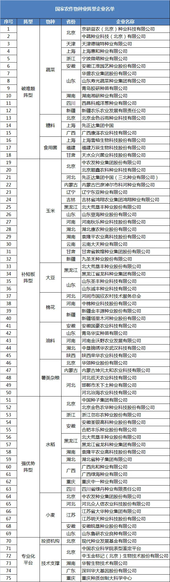 备注:国家农作物种业阵型企业共69家,其中北大荒垦丰种业股份有限公司同时入选水稻强优势阵型和玉米、大豆补短板阵型,袁隆平农业高科技股份有限公司同时入选水稻强优势阵型和玉米补短板阵型,中农发种业集团股份有限公司同时入选小麦强优势阵型和玉米补短板阵型,黑龙江省龙科种业集团有限公司同时入选水稻强优势阵型和大豆补短板阵型,先正达集团中国同时入选玉米补短板阵型和糖料破难题阵型。