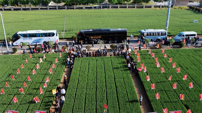 大会伊始,参会嘉宾前往华冠种业小麦展示基地进行观摩。现场展示的小麦品种令人瞩目:冠麦2号作为河南省农业主导品种,河南省重大品种研发推广应用一体化项目,以其高产稳产、综合抗性强等优势,连续多年在黄淮麦区表现突出;2024年通过国家审定的冠麦10号(国审麦20241020),凭借高产与抗逆性强等特性,迅速获得市场认可,更荣膺“2024年国家核心展示综合表现优良品种”称号;同样于2024年通过国审的冠麦16(国审麦20241021),则凭借高产、抗倒伏及适应性广的特点,成为黄淮麦区经销商们争相认可的热门品种。这些优异品种的集中展示,充分彰显了华冠种业在小麦育种领域的强大实力与卓越成果。