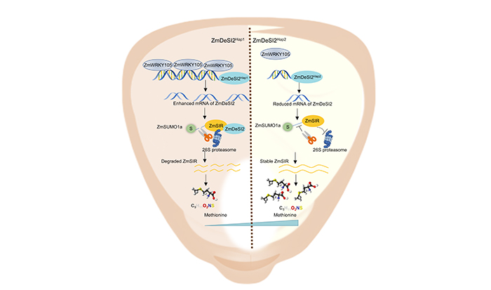 研究团队对348份玉米自交系进行了全基因组关联分析,结合授粉后20天籽粒胚乳表达量数据,鉴定到一个调控玉米籽粒蛋氨酸含量的关键基因ZmDeSI2。研究表明,该基因启动子区域内存在的突变能够直接影响有关转录因子与该基因的结合能力,从而显著降低基因表达。进一步研究发现,该基因通过调控亚硫酸盐还原酶ZmSIR的小类泛素化修饰水平,影响其蛋白积累以及蛋氨酸生物合成。随后,研究人员将该基因的优异单倍型回交转育至自交系WC009,在其他农艺性状保持稳定的情况下,其籽粒蛋氨酸含量显著提升。该研究为高蛋氨酸玉米培育提供了理论基础和可行路径。