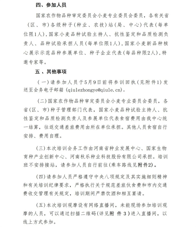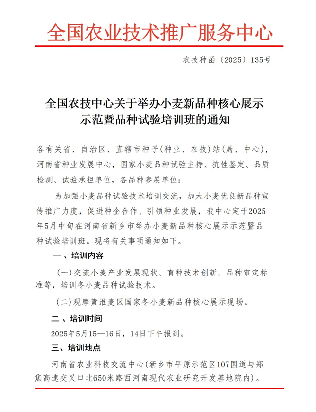 品种试验技术培训交流,加大小麦优良新品种宣传推广力度,促进种企合作、引领种业发展,我中心定于2025年5月中旬在河南省新乡市举办小麦新品种核心展示示范暨品种试验培训班。现将有关事项通知如下。