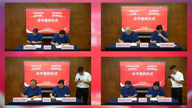 会议期间,康农种业与中国农业大学农学院、北京市农林科学院玉米研究所、安徽农业大学、东北农业大学农学院、黑龙江省农业科学院玉米研究所、吉林省农业科学院玉米研究所、河南农业大学、山东农业大学、四川农业大学、西北农林科技大学等十家科研院所正式签署战略合作协议。此次合作突破地域限制,汇聚东华北、黄淮海、西南区域科研力量,构建“基础研究—品种培育—示范推广—产业服务”一体化创新体系,整合各方种质资源、育种技术及市场转化优势,推动玉米种业技术突破与全产业链协同发展。
