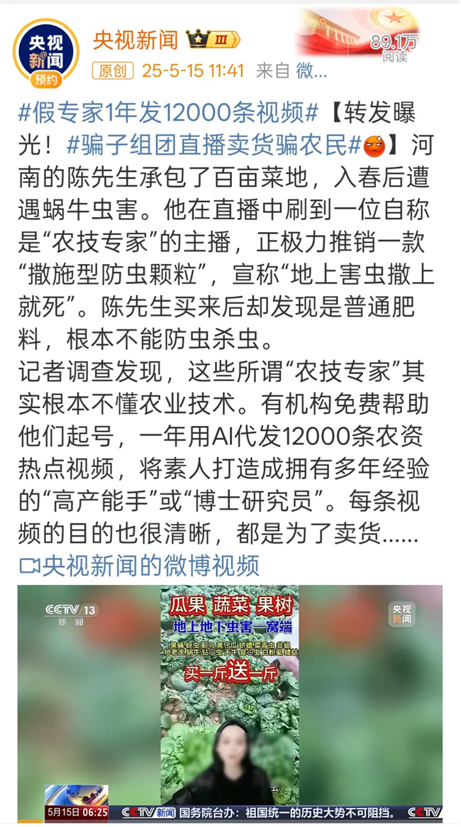 5月15日,央视新闻官方微博发布一条新闻:河南的陈先生承包了百亩菜地,偶然间,他在网上刷到一个“农技专家”的直播,教他如何防治菜地害虫,并且极力推销自己的“撒施型防虫颗粒”产品,陈先生下单购买后才发现,这款产品虽然在包装袋上印着“撒施型防虫颗粒”,但在包装袋背面,产品的通用名称却是“中量元素水溶肥”,主要作用是补充营养,产品登记号还是冒用的。