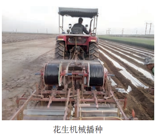 选用能够一次性完成起垄、播种、镇压、铺设滴灌带、喷施除草剂、覆膜、覆土等工序的播种机。起垄幅宽85厘米,垄面宽度55厘米,垄上种植2行花生,行距30厘米,播种深度2~3厘米;滴灌带铺设到垄上中间位置,铺设时使滴灌带光滑的一面与地膜接触;滴灌带卷轴要转动灵活,放带松紧适宜,避免通水后滴灌带遇冷收缩,造成滴灌带与供水管道连接脱落。