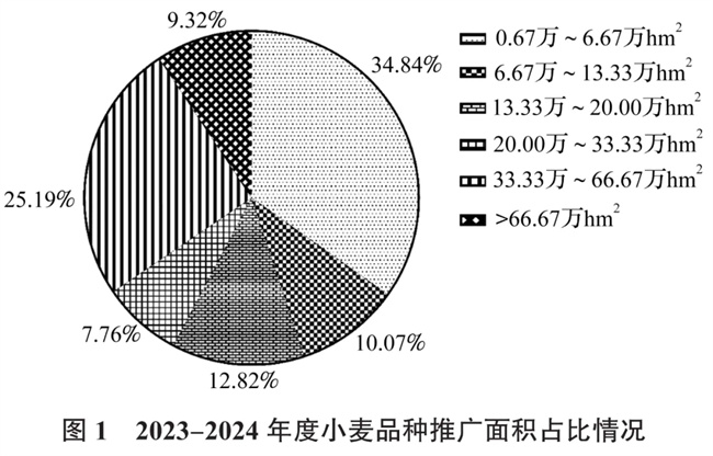 2023-2024年度全国小麦种植面积在0.67万hm²(10万亩)以上的小麦品种共有420个,累计推广总面积1981.87万hm²(29728万亩)。其中,推广面积0.67万~6.67万hm²(10万~100万亩)的品种363个,累计推广面积690.47万hm²,占累计推广总面积的34.84%;推广面积6.67万~13.33万hm²(100万~200万亩)的品种22个,累计推广面积199.60万hm²;推广面积13.33万~20.00万hm²(200万~300万亩)的品种16个,累计推广面积254.13万hm²;推广面积20.00万~33.33万hm²(300万~500万亩)的品种6个,累计推广面积153.80万hm²;推广面积33.33万~66.67万hm²(500万~1000万亩)的品种11个,包括济麦44(65.67万hm²)、中麦578(62.80万hm²)、郑麦379(52.53万hm²)、西农511(52.07万hm²)、百农4199(45.87万hm²)、周麦36号(40.13万hm²)、烟农999(38.80万hm²)、山农28号(37.33万hm²)、马兰1号(35.47万hm²)、烟农1212(34.80万hm²)和郑麦136(33.73万hm²),累计推广面积499.20万hm²,其中济麦44、中麦578、西农511和周麦36号为优质强筋小麦;推广面积66.67万hm²(21000万亩)以上的有济麦22(108.87万hm²)和郑麦1860(75.80万hm²),占0.67万hm²以上品种累计推广面积的9.32%(图1)。