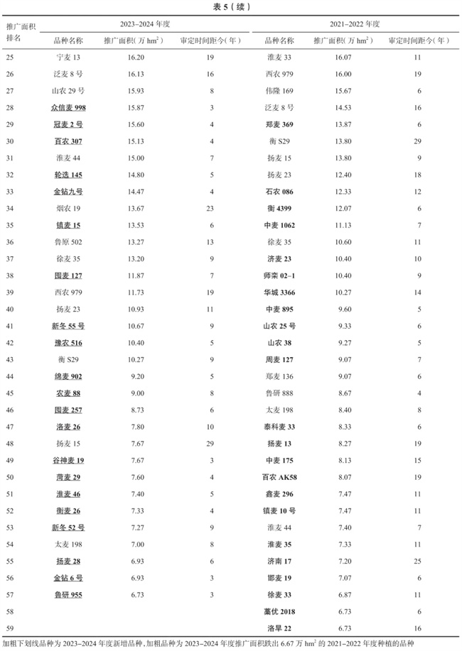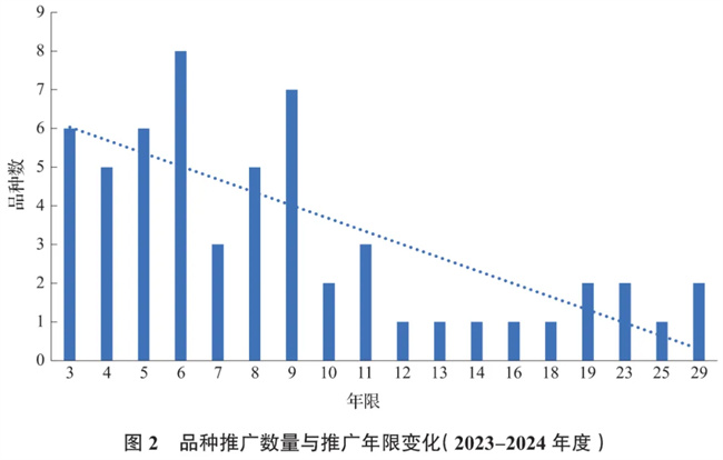 对2023-2024年度推广应用面积在13.33万hm²以上的57个品种进行分析,品种审定年份在1995-2021年之间,推广年限在3~29年间,平均推广9.35年,2023-2024年度累计推广面积1291.40万hm²。从审定推广年限与推广品种数量来分析,一般在审定后5~9年进行推广的品种最多(图2)。弱筋小麦扬麦15于1995年审定,2005年在江苏再次审定,现距初审已有29年,2024年推广面积仍有7.67万hm²。新冬20号和新冬22号具有较好的拉面品质,在新疆地区分别审定29年和25年后,现在推广面积达23.67万hm²和17.73万hm²。烟农19于2001年在江苏和山东通过审定,于2022年在山东再次通过审定,2023-2024年度推广面积13.67万hm²。郑麦9023于2001年通过河南省审定、2003年通过国审,距今已有20多年,2023-2024年度仍有16.67万hm²的推广面积。