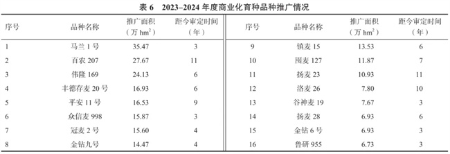 2023-2024年度我国推广应用面积在6.67万hm²以上的57个品种中,第一育种单位均为科研单位或公司。企业商业化育成品种16个,品种数量占28.07%,推广面积占18.51%(表6)。其中,推广面积在33.33万hm²以上的品种中商业化育成品种1个(马兰1号),为2021年河北省审定,居推广面积第1位,推广面积占商业化育种总推广面积的24.62%;推广面积20.00万~33.33万hm²品种中商业化育成品种有2个,品种数量占12.50%,推广面积占21.67%;推广面积13.33万~20.00万hm²品种中商业化育成品种有6个,品种数量占37.50%,推广面积占38.87%;推广面积6.67万~13.33万hm²品种中商业化育成品种有7个,品种数量占43.75%,推广面积占24.62%。总体来看,企业已经成为小麦品种选育的主要力量之一,推广面积在6.67万~20.00万hm²之间的品种所占比例增高。