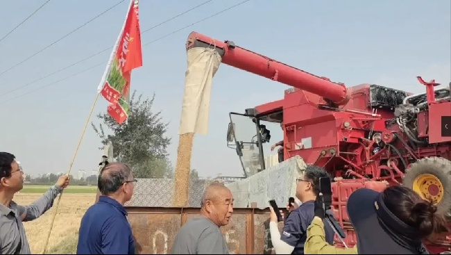 2025年6月13日,河北省石家庄市新乐市堽头村的麦田里,金浪翻涌,麦香四溢。一台台收割机穿梭其间,农用车满载新麦有序驶离,田间地头洋溢着丰收的喜悦。与往年不同的是,这片800余亩的麦田里,活跃着一群“特殊客人”——戴着草帽、手持测量工具的农业专家,架着无人机航拍的记录人员,以及围在田埂上边看边议的周边农户。这里,正上演着一场“科技感”十足的小麦实打实收测产现场,而主角,是河北省企业自主培育大面积推广的稳产高产优质小麦品种“沃麦33”。