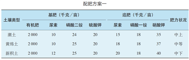 方案一:根据不同土壤类型,确定化肥以尿素、磷酸二铵、硫酸钾为基肥,尿素、磷酸一铵、硝酸钾为追肥的配肥方案,详见下表。