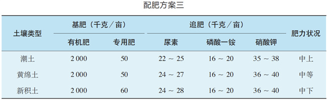 方案二:根据不同土壤类型,确定化肥以尿素、磷酸一铵、氯化钾为基肥,尿素、磷酸一铵、硝酸钾为追肥的配肥方案,详见下表。