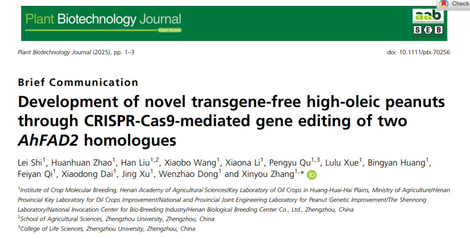 近日, 河南省农业科学院张新友院士团队在国际知名学术期刊Plant Biotechnology Journal (IF 2024=10.5,中科院生物学一区,JCR5%)上发表了题为“Development of novel transgene-free high-oleic peanuts through CRISPR-Cas9 mediated gene editing of two AhFAD2 homologues”的研究论文,利用CRISPR/Cas9介导的基因编辑技术敲除花生AhFAD2基因,创制出不含外源基因的高油酸花生新种质,为花生新种质创制及对现有主栽品种精准改良提供了新途径。