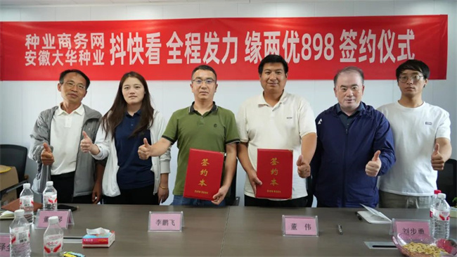2025年7月21日,江苏省大华种业集团有限公司安徽分公司经理李鹏飞一行莅临种业商务网直播基地进行考察交流,并与种业商务网“抖快看”签订了缘两优898大单品流量增长合作协议。