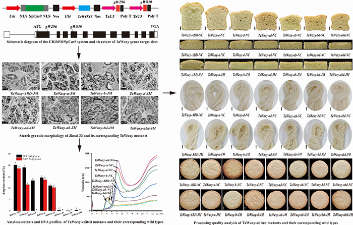 科研团队前期研究证实TaWaxy基因表达量可直接影响直链淀粉含量。随后该团队利用基因编辑技术构建了高效基因编辑载体,并成功对我国主栽小麦品种“济麦22”和“宁春4号”的TaWaxy基因进行编辑,获得了7种无转基因元件的突变体,其直链淀粉含量均低于对照品种,最低可降低至0%,并表现出典型糯小麦特性。进一步分析表明,2个突变体分别表现出更好的面条及饼干加工品质。该研究为专用小麦品种的定向改良提供了重要的理论基础和材料支撑。