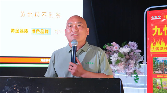 久恒农业销售总经理窦明震在会上从抗性强、品质优、丰产性好三大方面详细阐述了九恒丰11的核心竞争优势,并对市场布局与推广策略进行了深入解读。他指出,久恒农业将继续加大研发投入,不断优化品种特性,为农业丰收和种业发展提供更加优质的产品和服务。