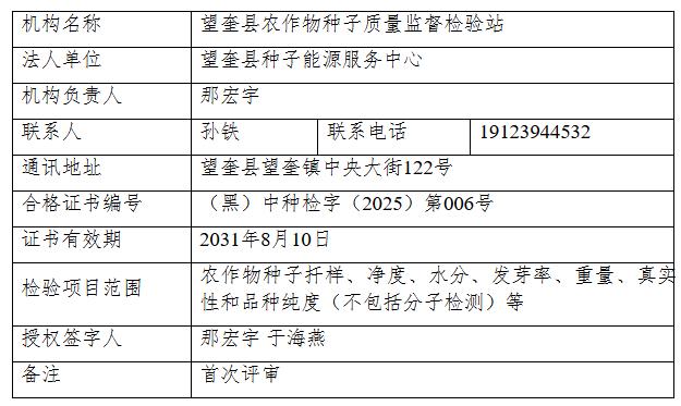 根据《中华人民共和国种子法》《农作物种子质量检验机构考核管理办法》等有关规定,经我厅组织专家进行评审,望奎县农作物种子质量监督检验站、海伦市农作物种子质量监督检验站等2家种子检验机构具备对外开展农作物种子检验的基本条件和能力,批准为合格种子检验机构,颁发《中华人民共和国农作物种子质量检验机构合格证书》,准许在批准的种子检验项目范围内使用农作物种子质量检验机构合格标志。
