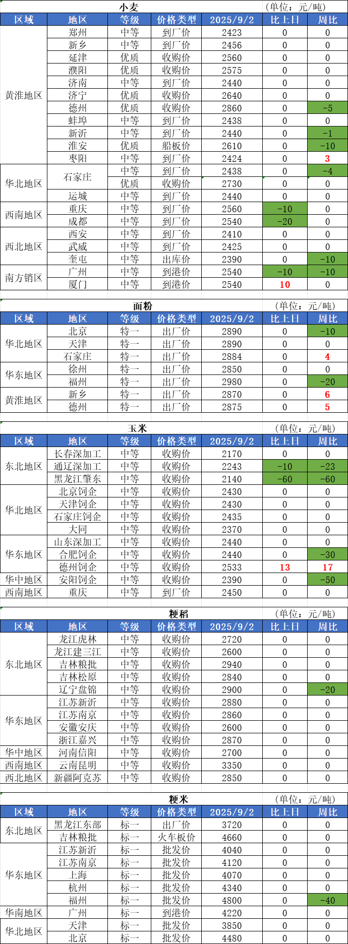 1、9月2日,小麦市场价格涨跌震荡,经过两天的小范围翻红,部分企业报价又重回下行通道。受下游实际消费持续低迷制约,小麦价格上涨缺乏持续动力支撑,市场再度陷入供需拉锯状态。