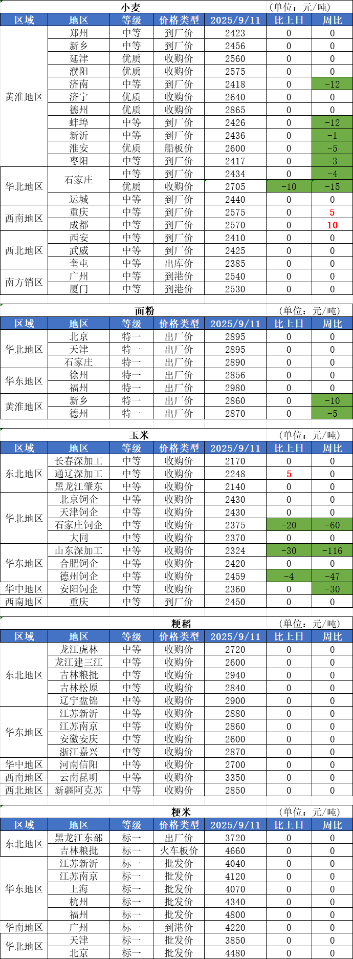 1、9月11日,小麦市场价格延续弱势下跌趋势,落价企业依旧集中于山东、河北,跌幅在5厘以内。截至目前,五省累计公布的托市收购库点超过563个,形成覆盖主产区全域的收购网络,持续打牢市场稳定的基础,强化政策托底效应。
